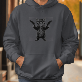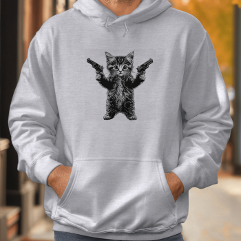 Unisex džemperis su spauda „Kačiukas su pistoletais“