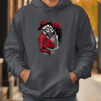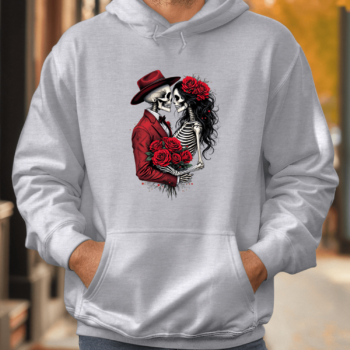 Unisex džemperis su spauda „Romantiška skeletų pora“