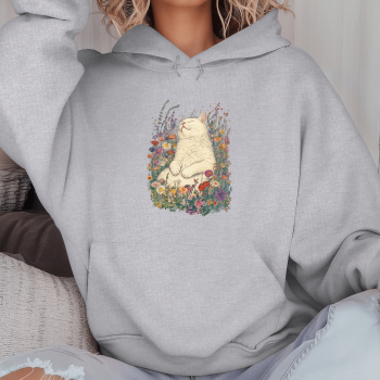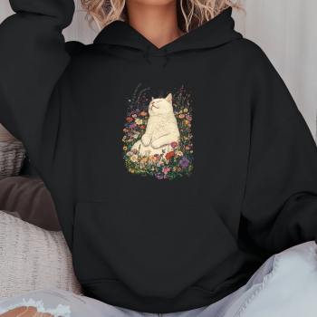 Unisex džemperis su spauda „Mieganti katė tarp gėlių“