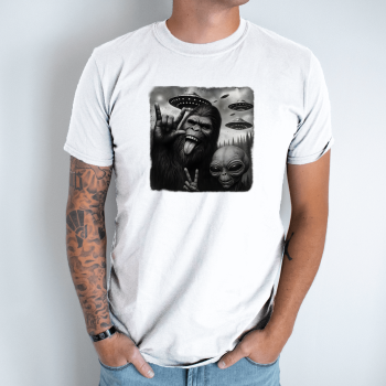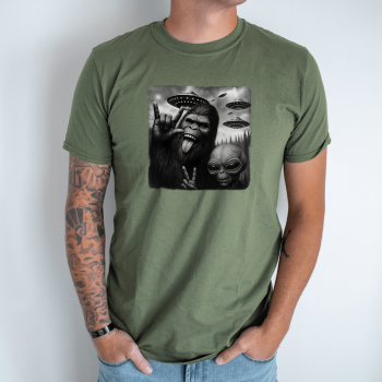 Unisex marškinėliai su spauda „Selfis su Bigfutu“