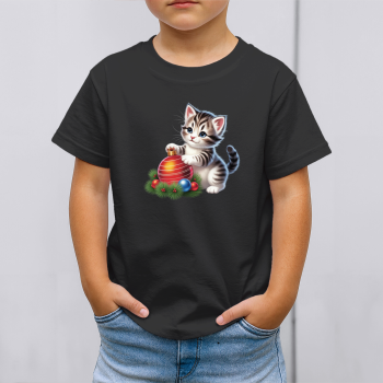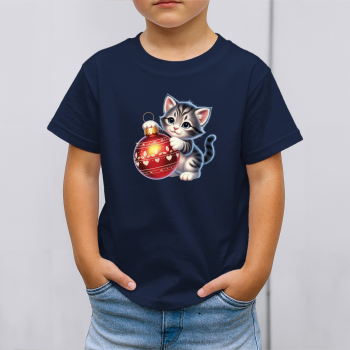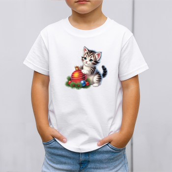 Vaikiški marškinėliai su spauda „Kačiukas su Kalėdiniu žaisliuku“
