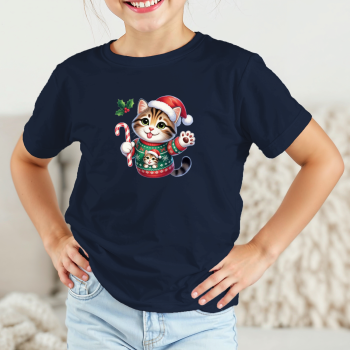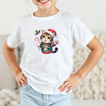 Vaikiški marškinėliai su spauda „Kačiukas su Kalėdiniu megztuku“