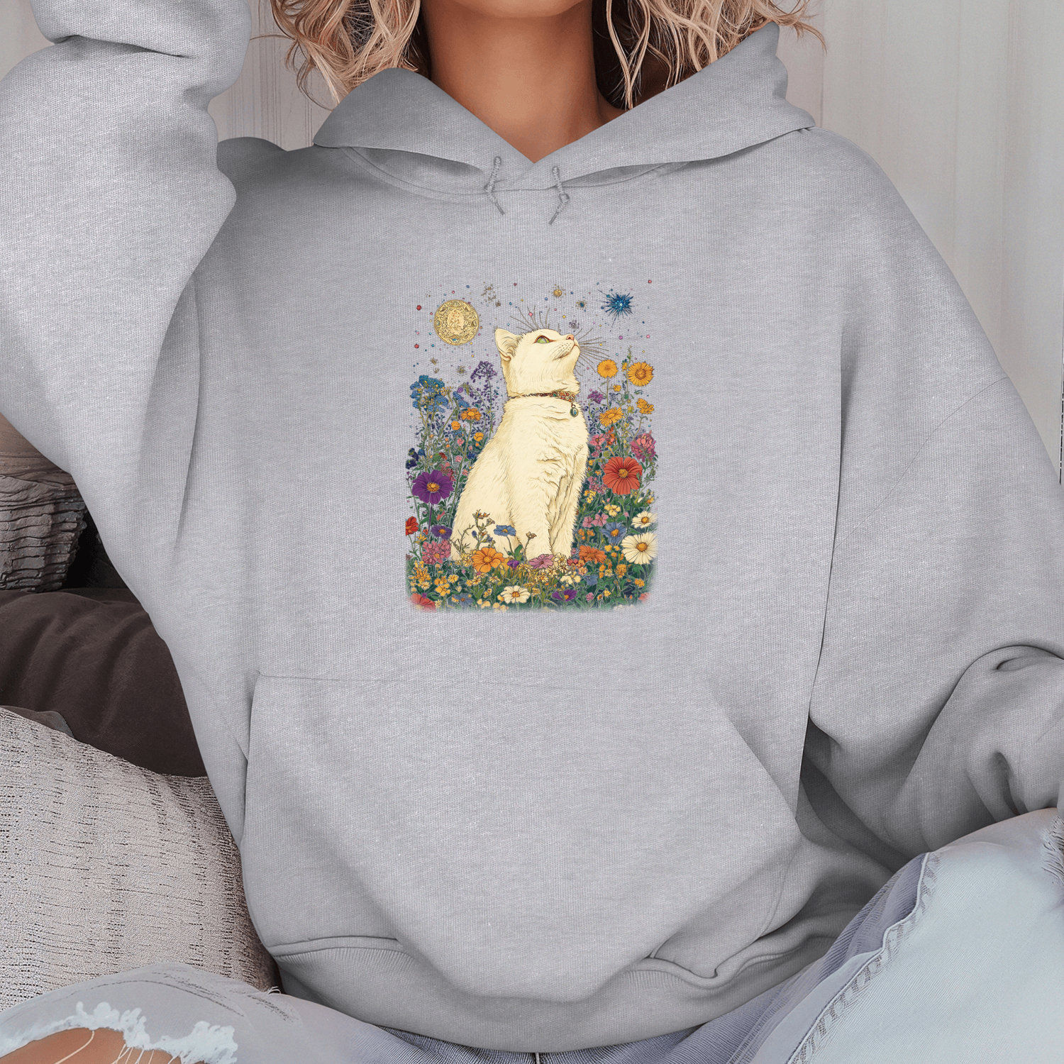 Unisex džemperis su spauda „Katė tarp gėlių“