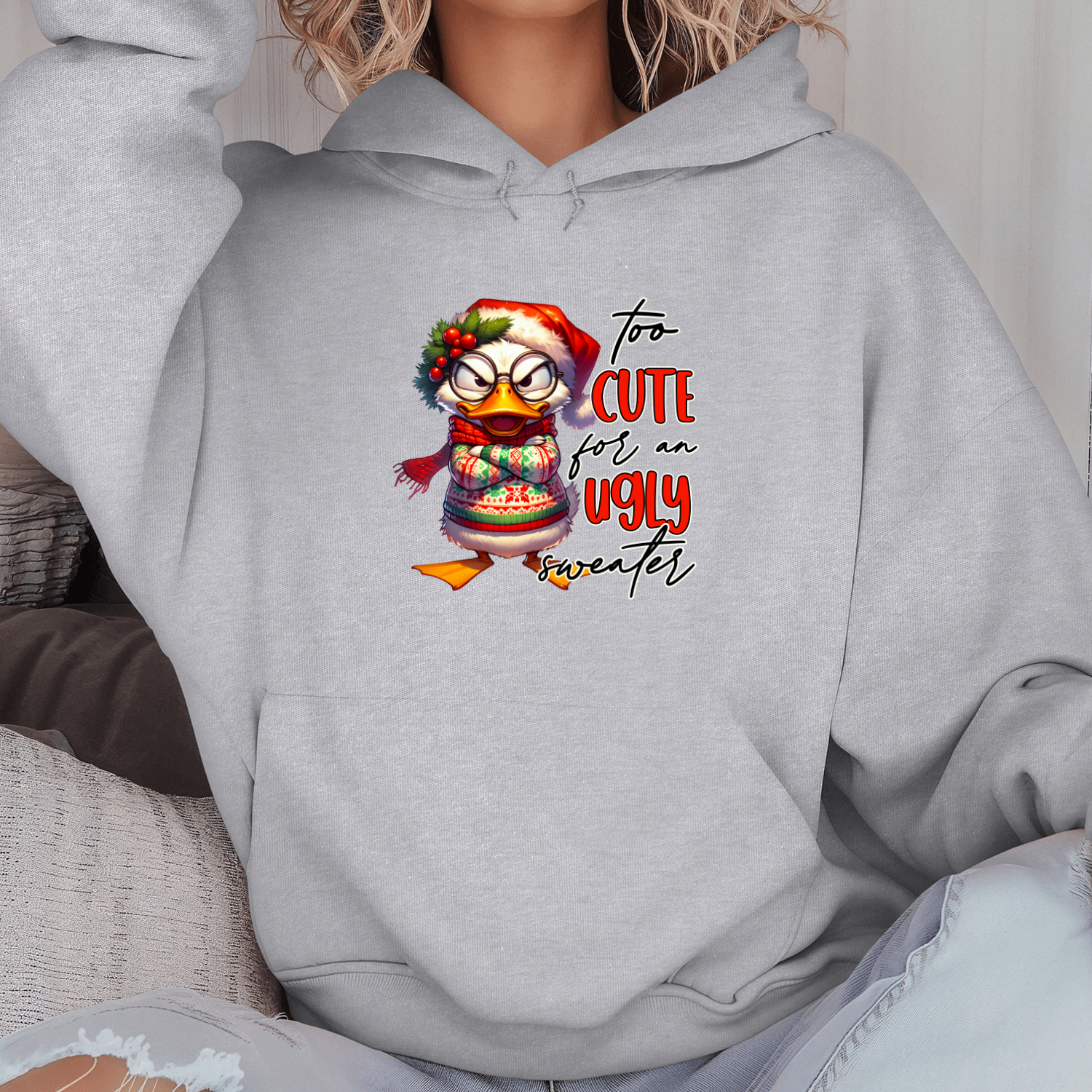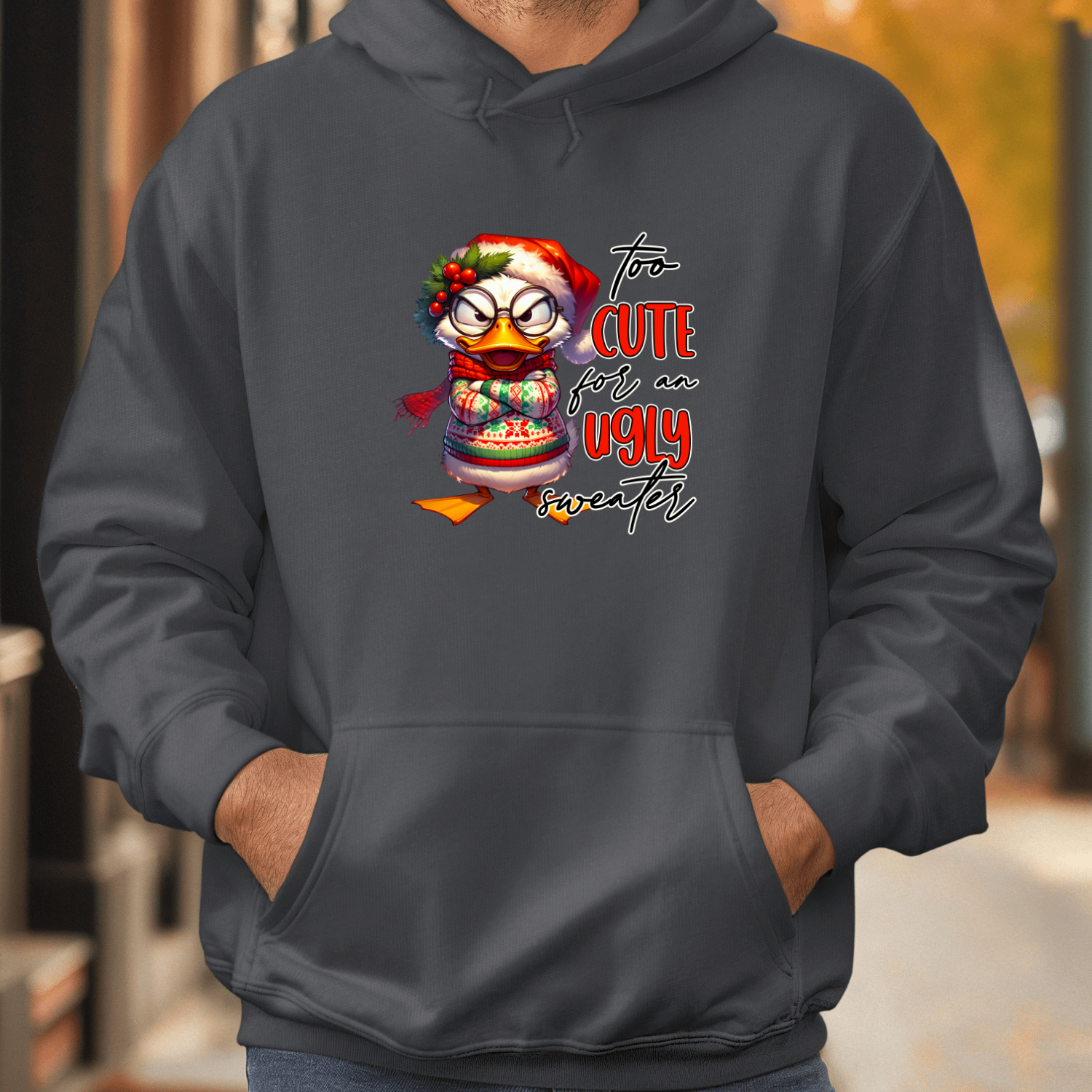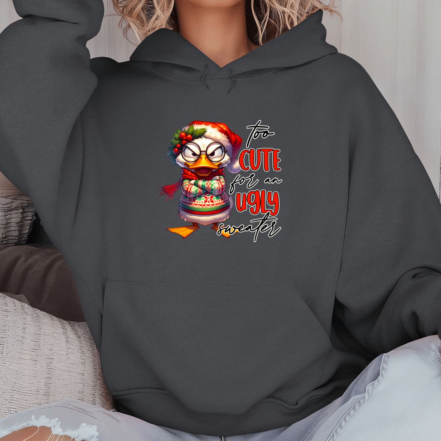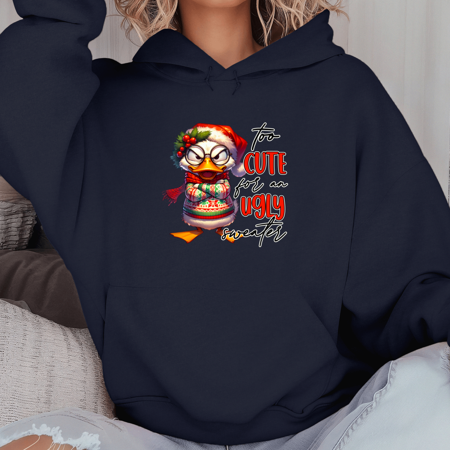 Unisex džemperis su spauda „Too cute for ugly sweater“
