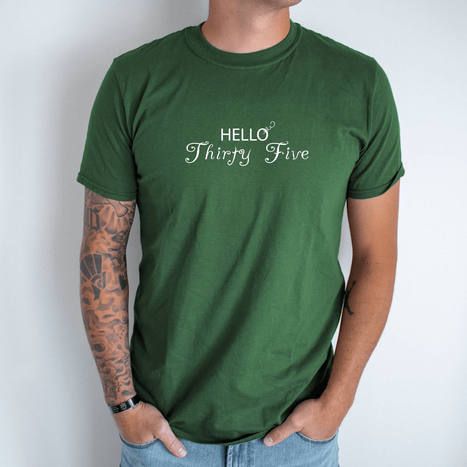 Unisex marškinėliai su spauda „Hello Thirty Five“