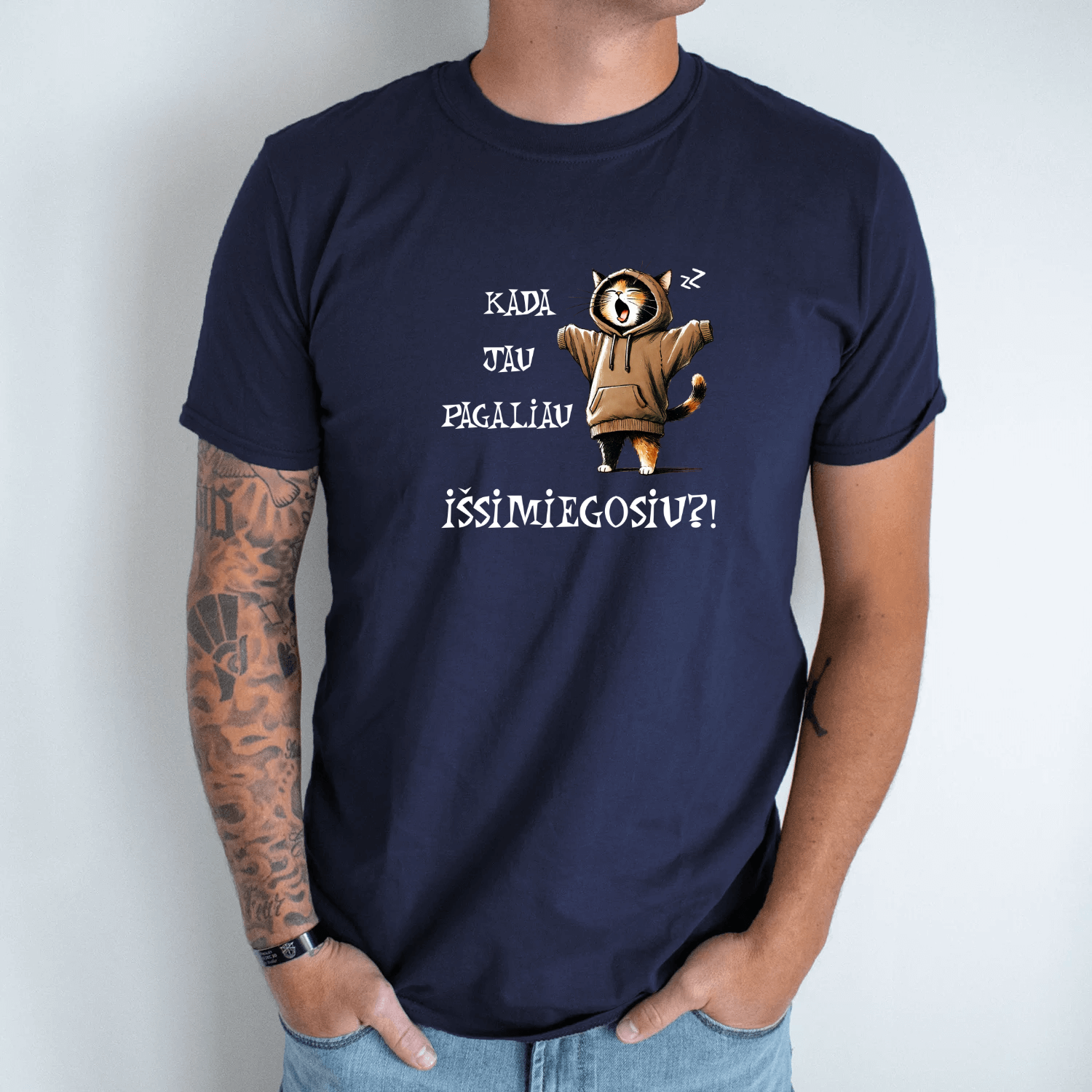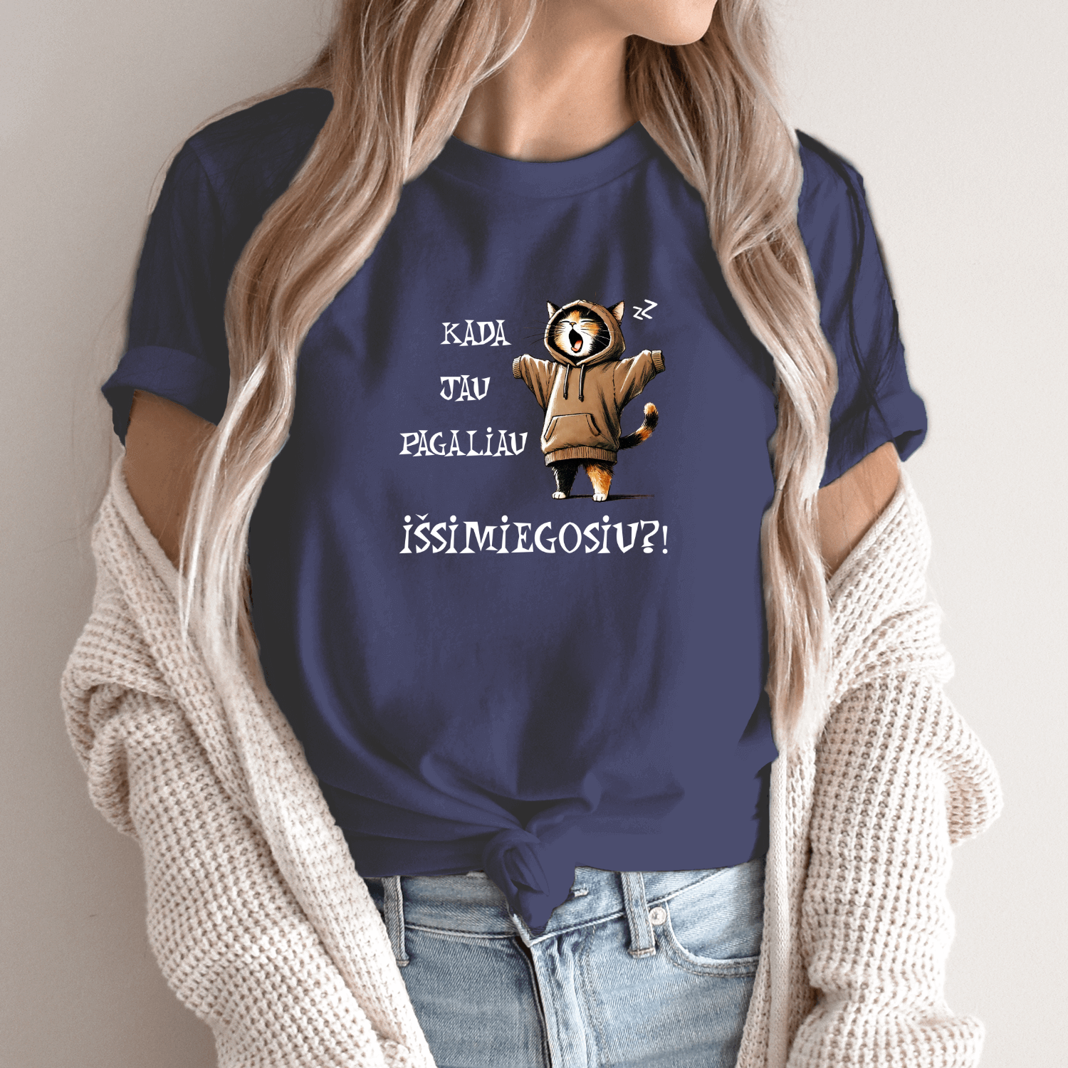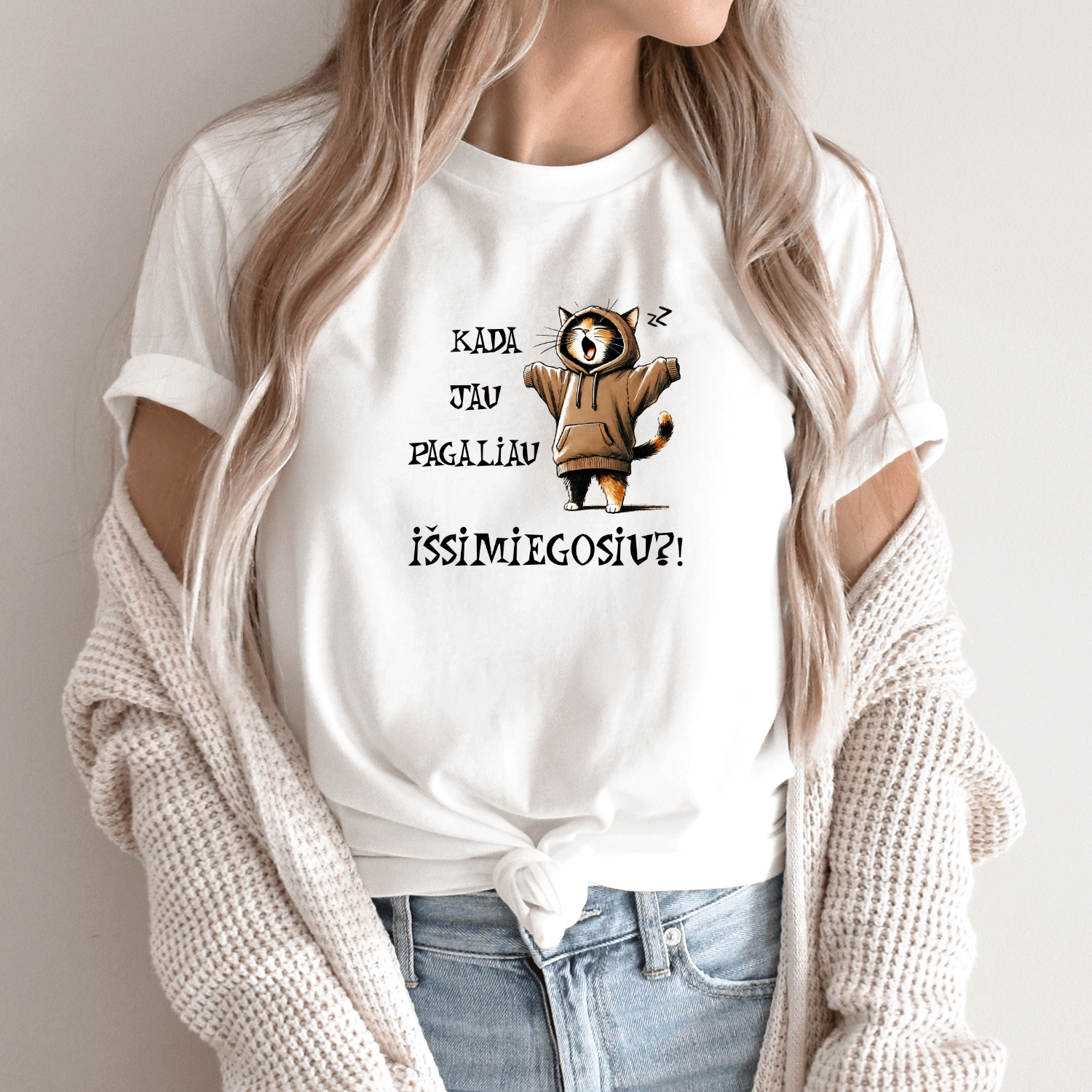 Unisex marškinėliai su spauda „Kada jau pagaliau išsimiegosiu?“