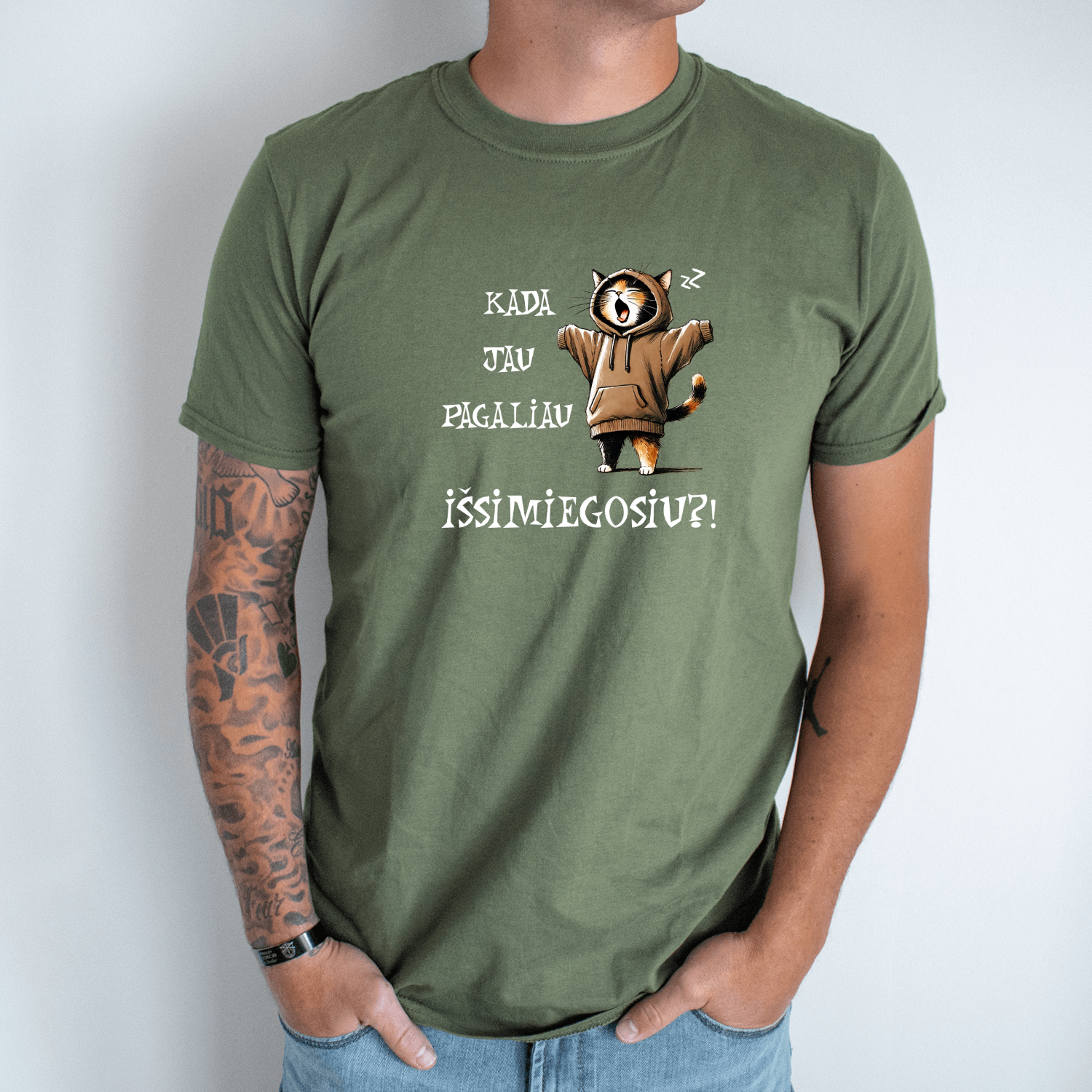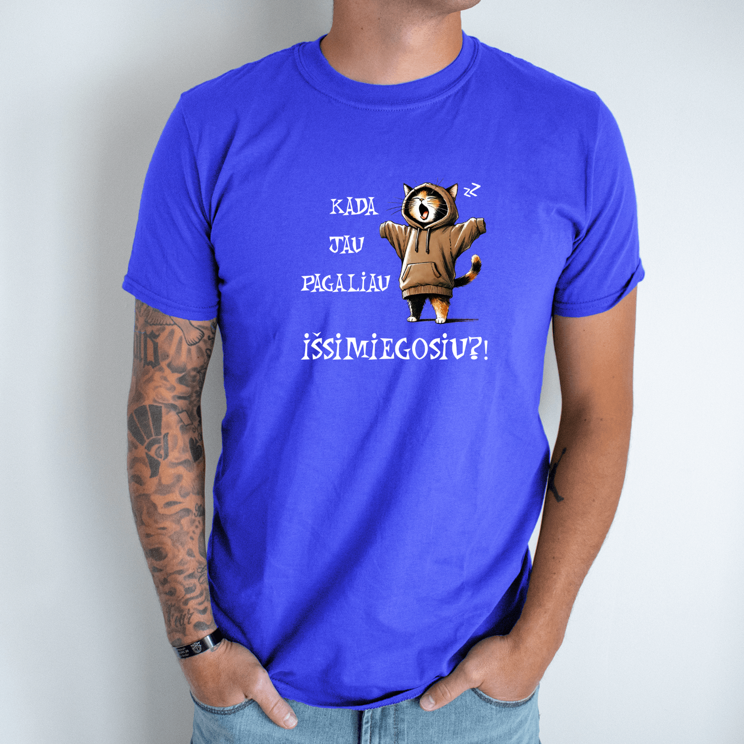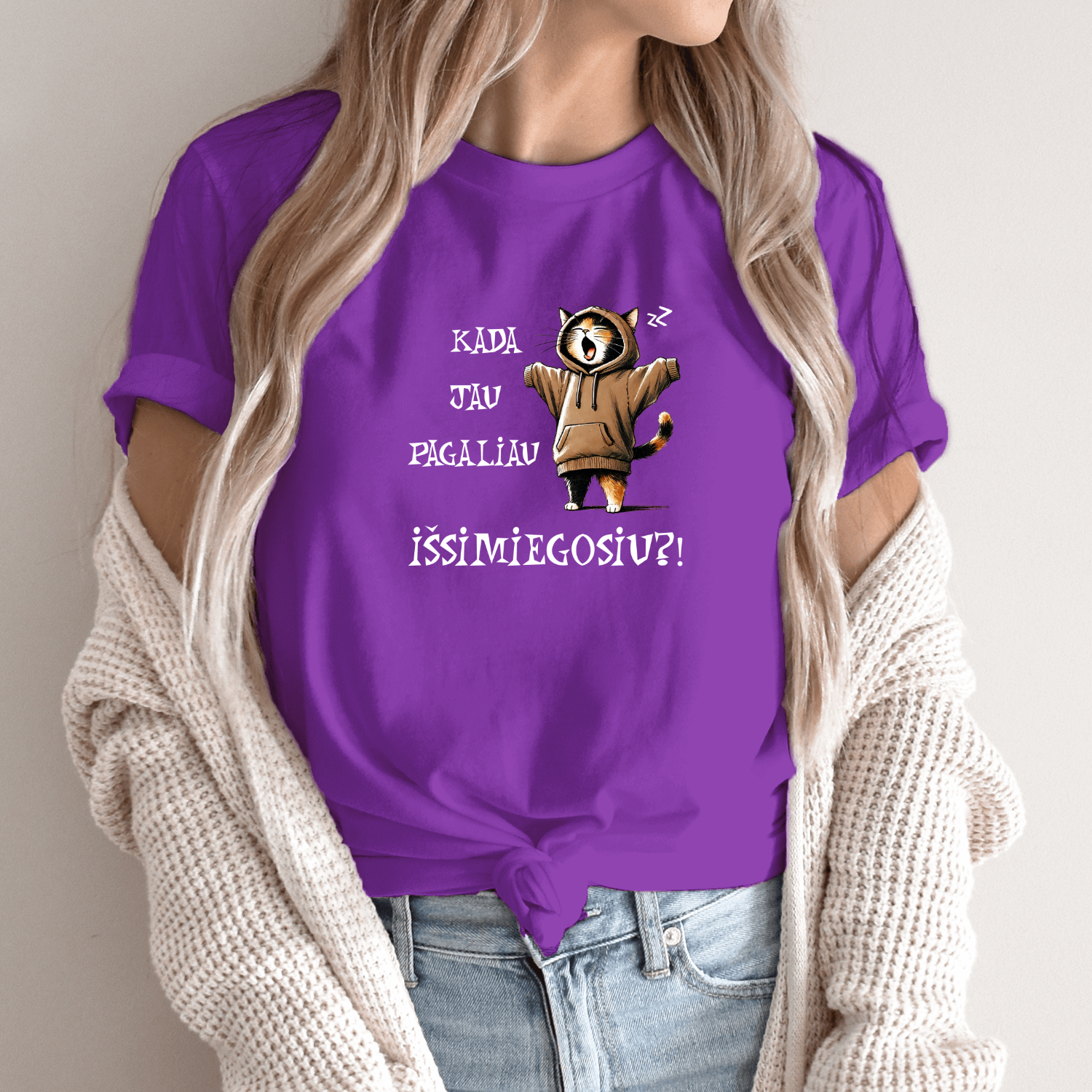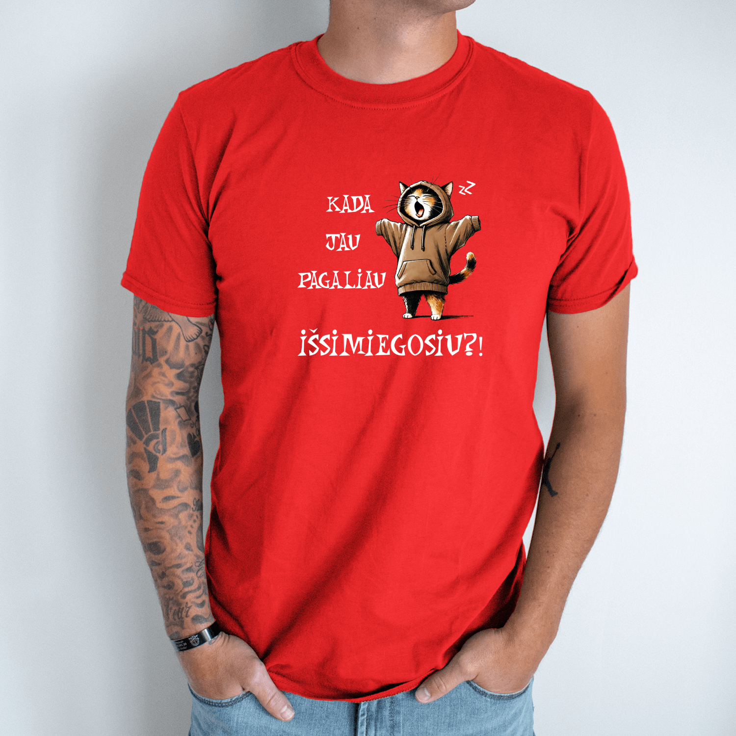 Unisex marškinėliai su spauda „Kada jau pagaliau išsimiegosiu?“
