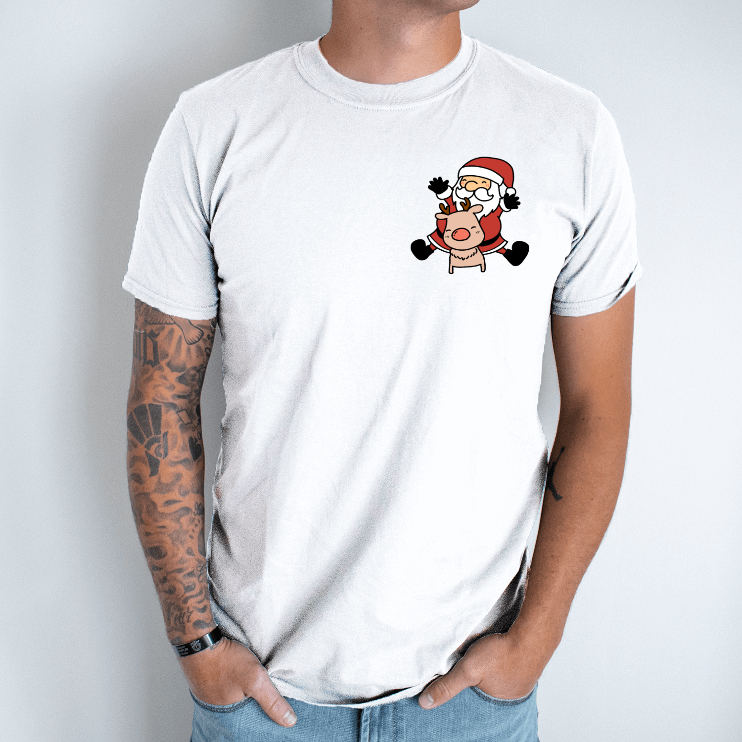 Unisex marškinėliai su spauda „Kalėdų senelis ir Rudolfas“