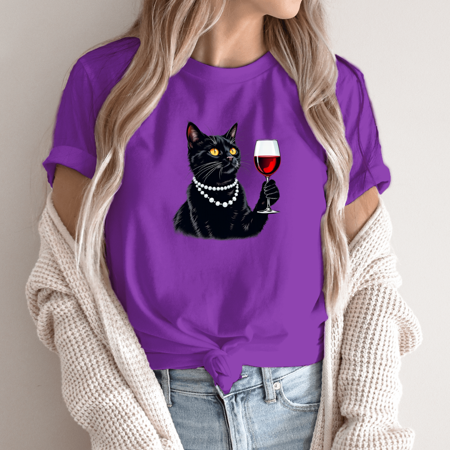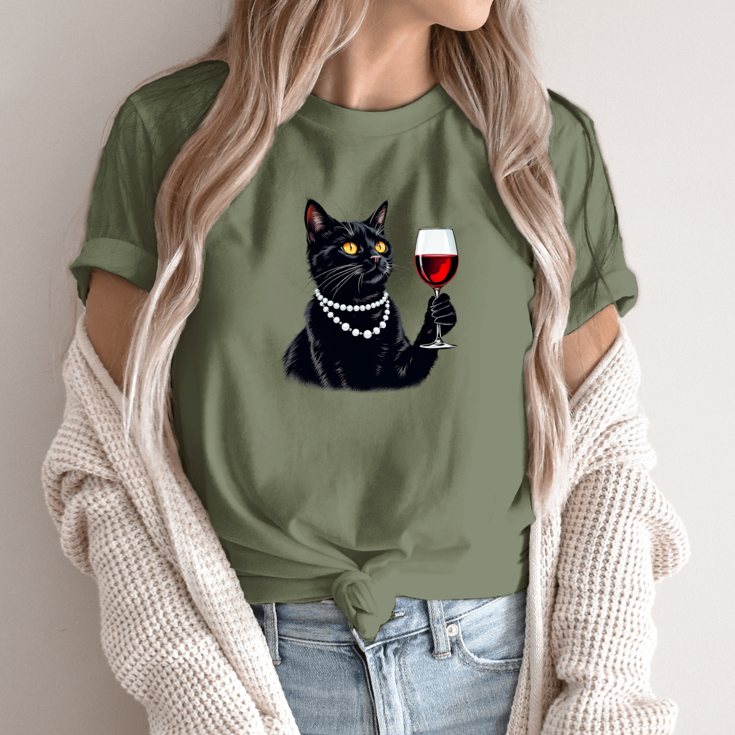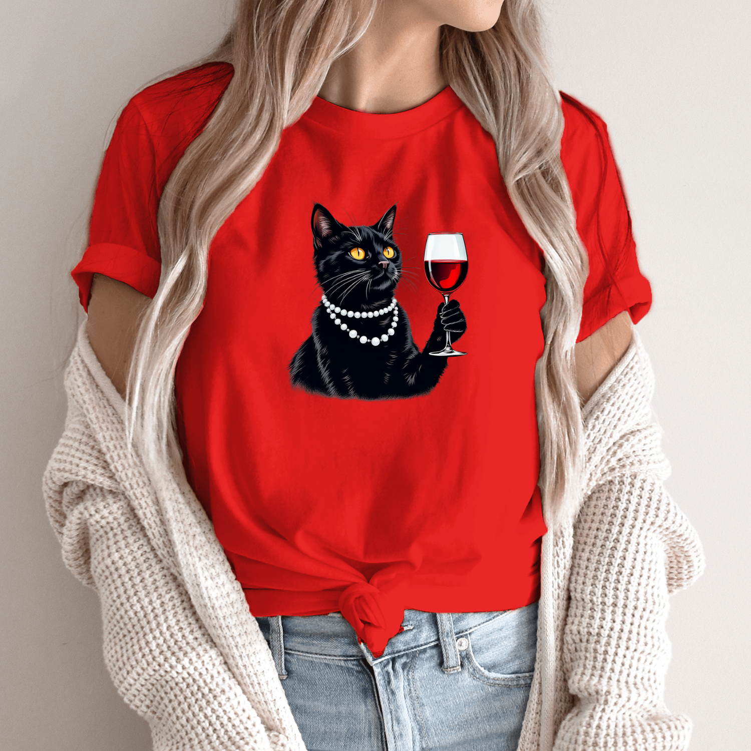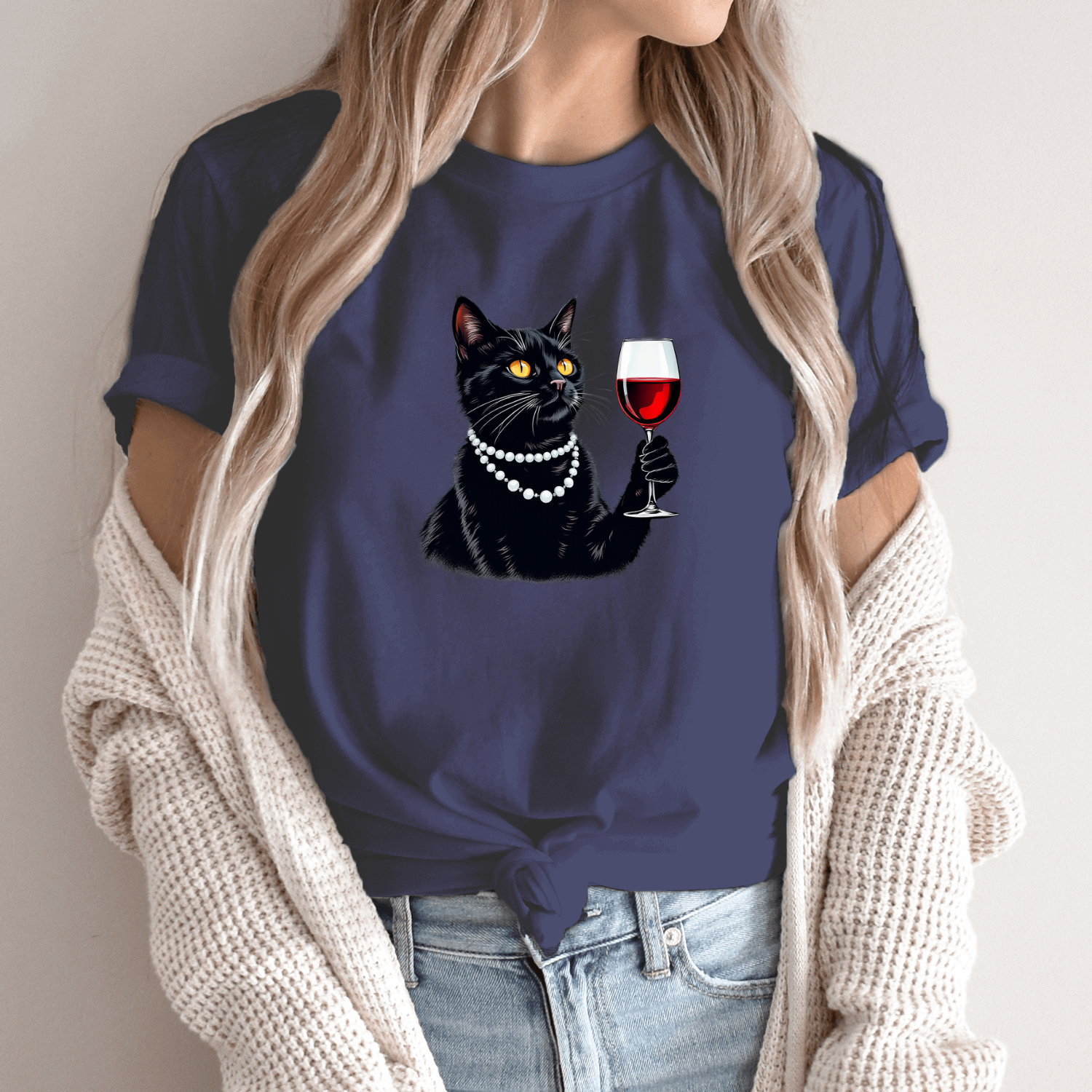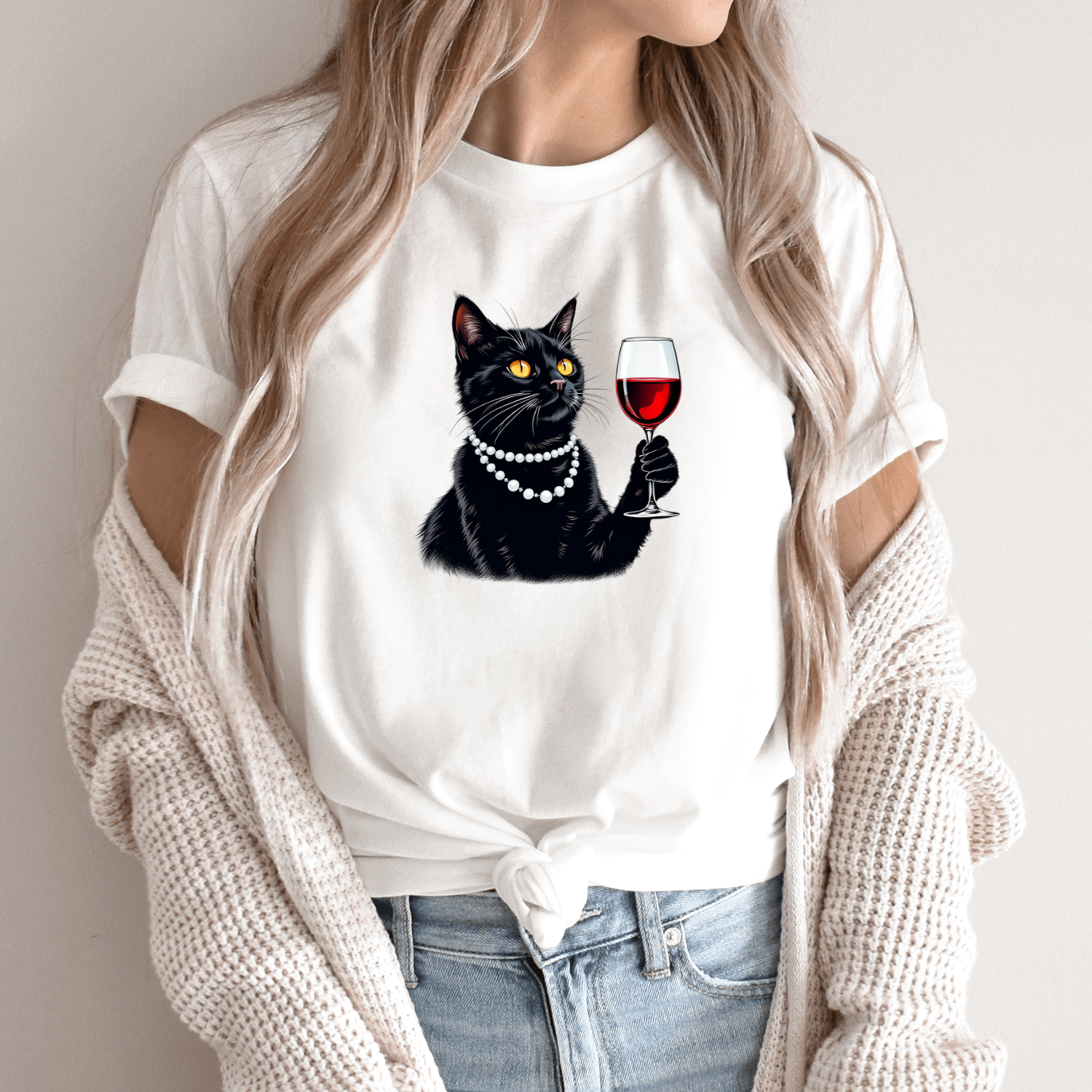 Unisex marškinėliai su spauda „Katė su vyno taure“