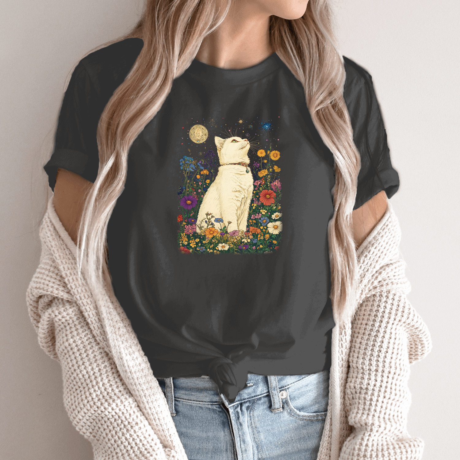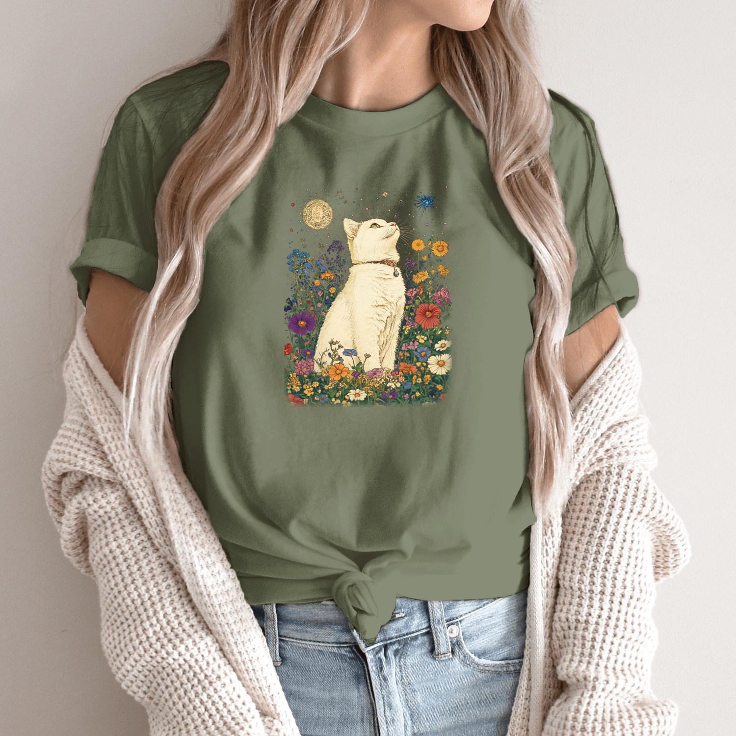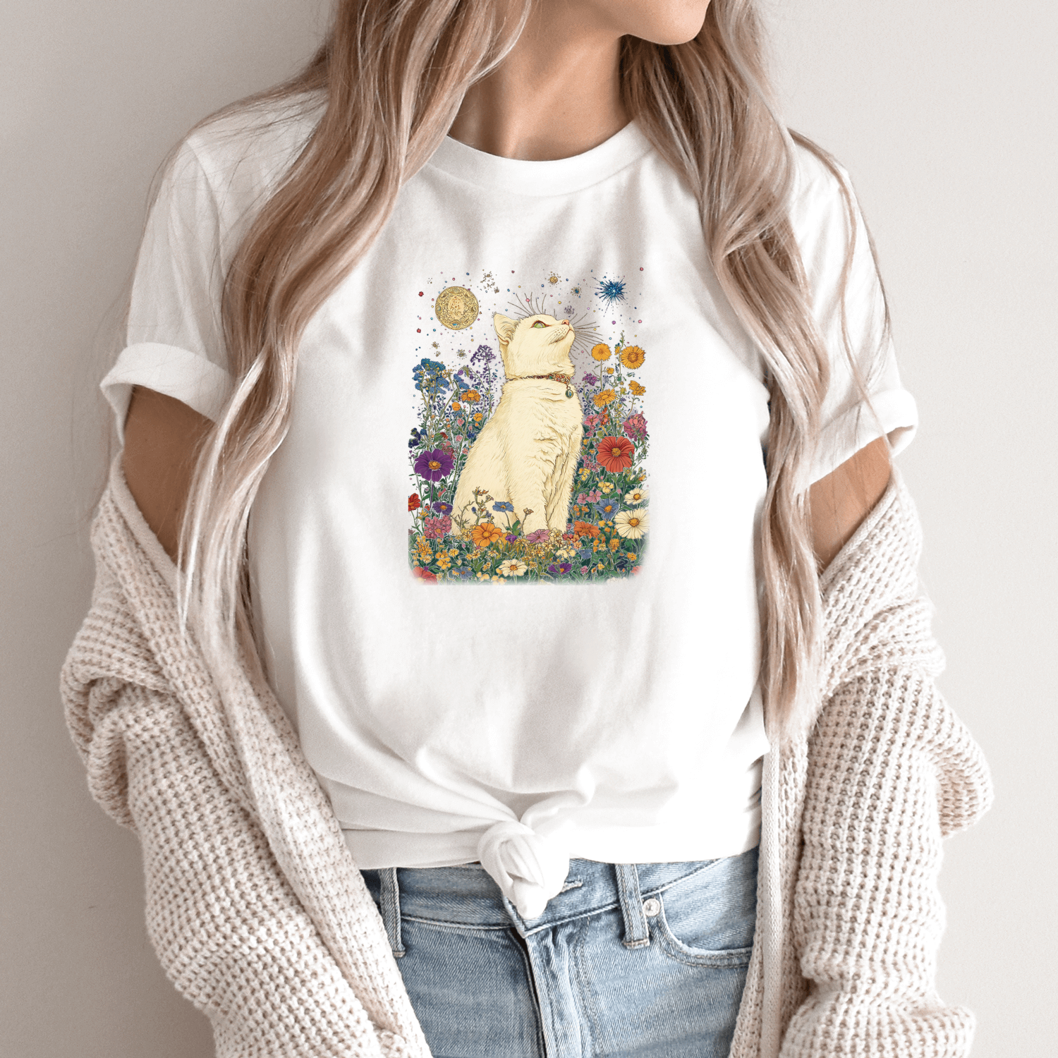 Unisex marškinėliai su spauda „Katė tarp gėlių“