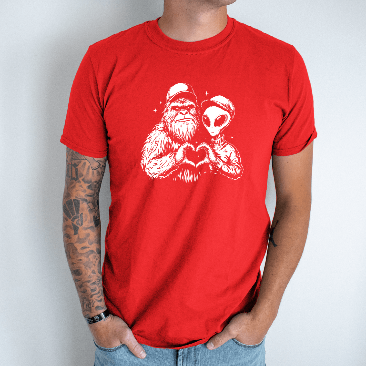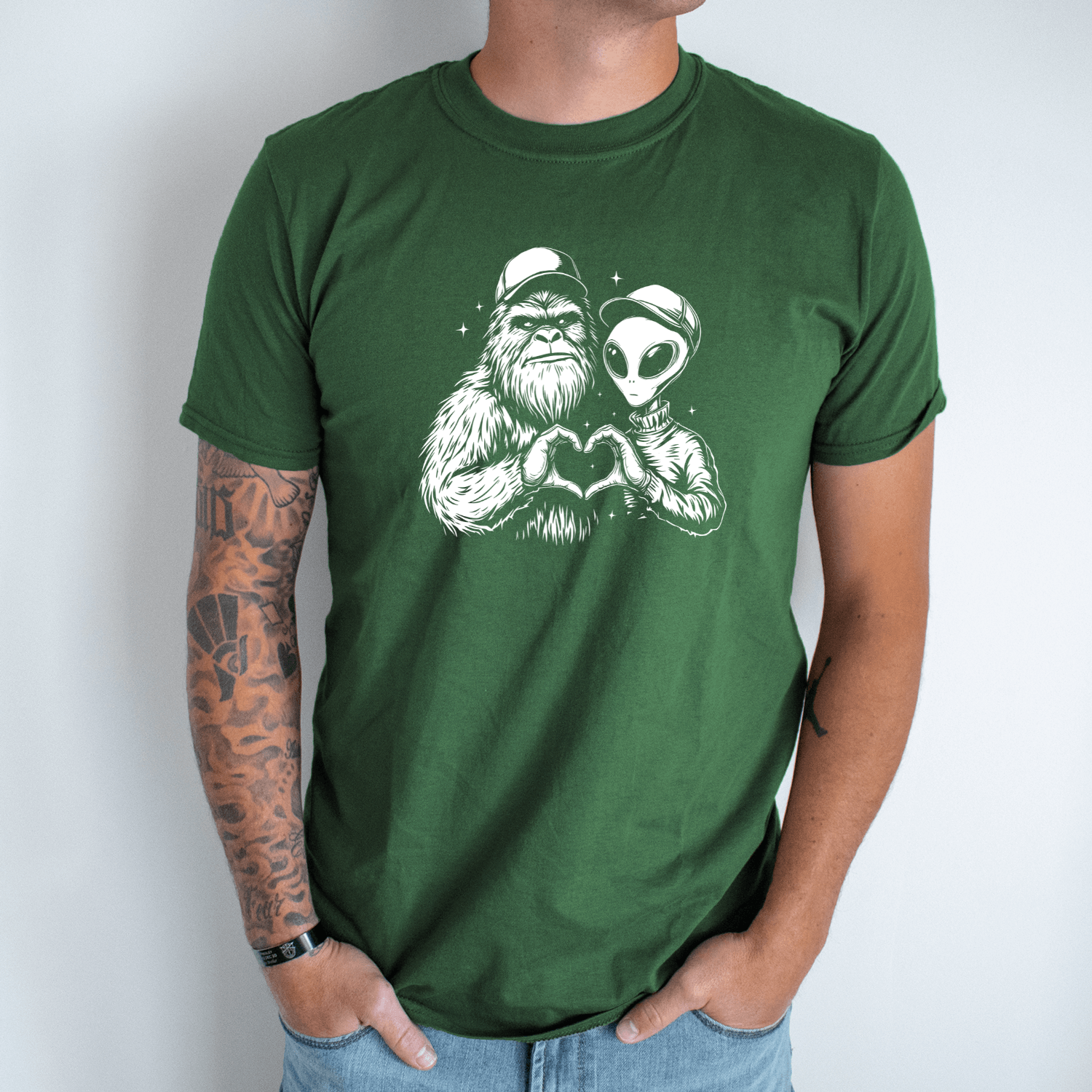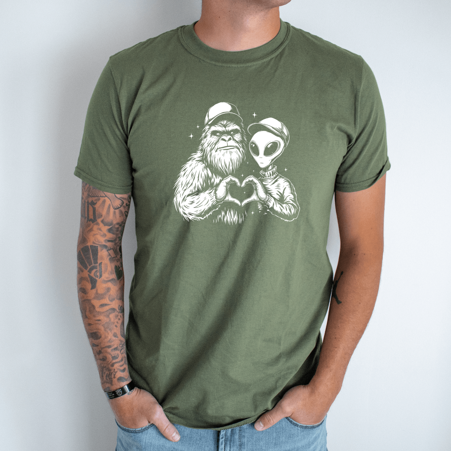 Unisex marškinėliai su spauda „Marsietis ir Bigfutas kartu“