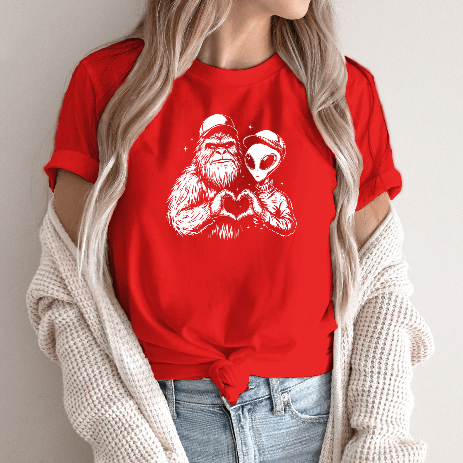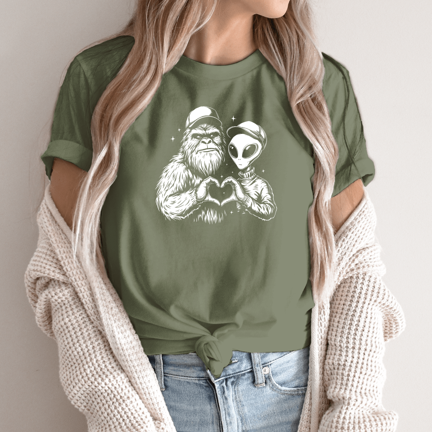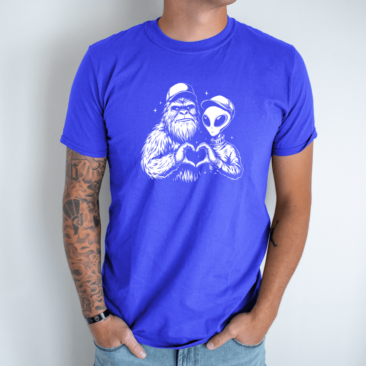 Unisex marškinėliai su spauda „Marsietis ir Bigfutas kartu“