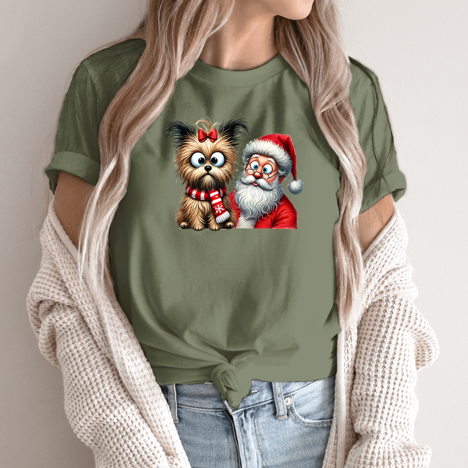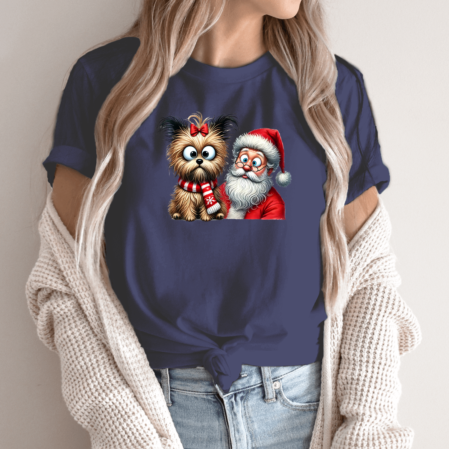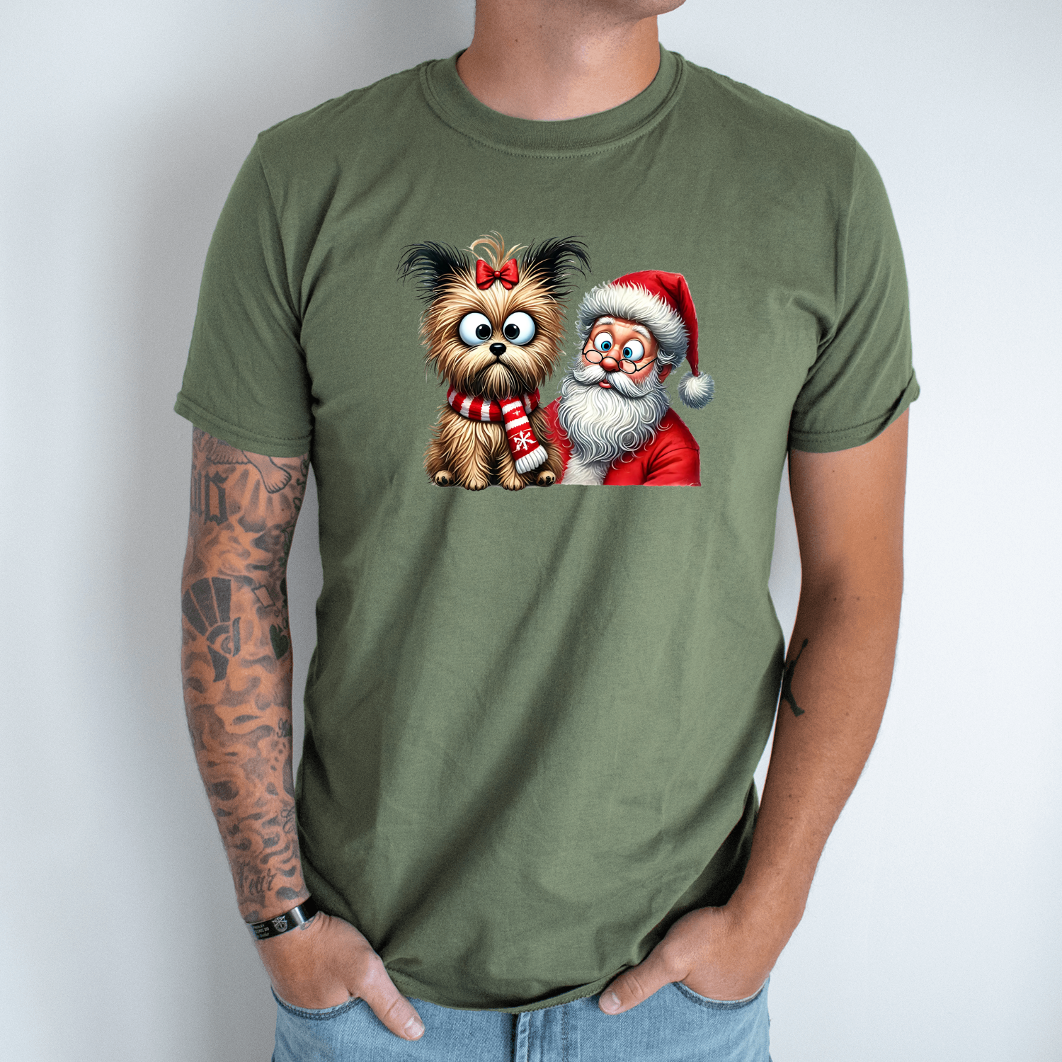 Būkite pirmas aprašęs “Unisex marškinėliai su spauda „Šuo pas Kalėdų senį“”