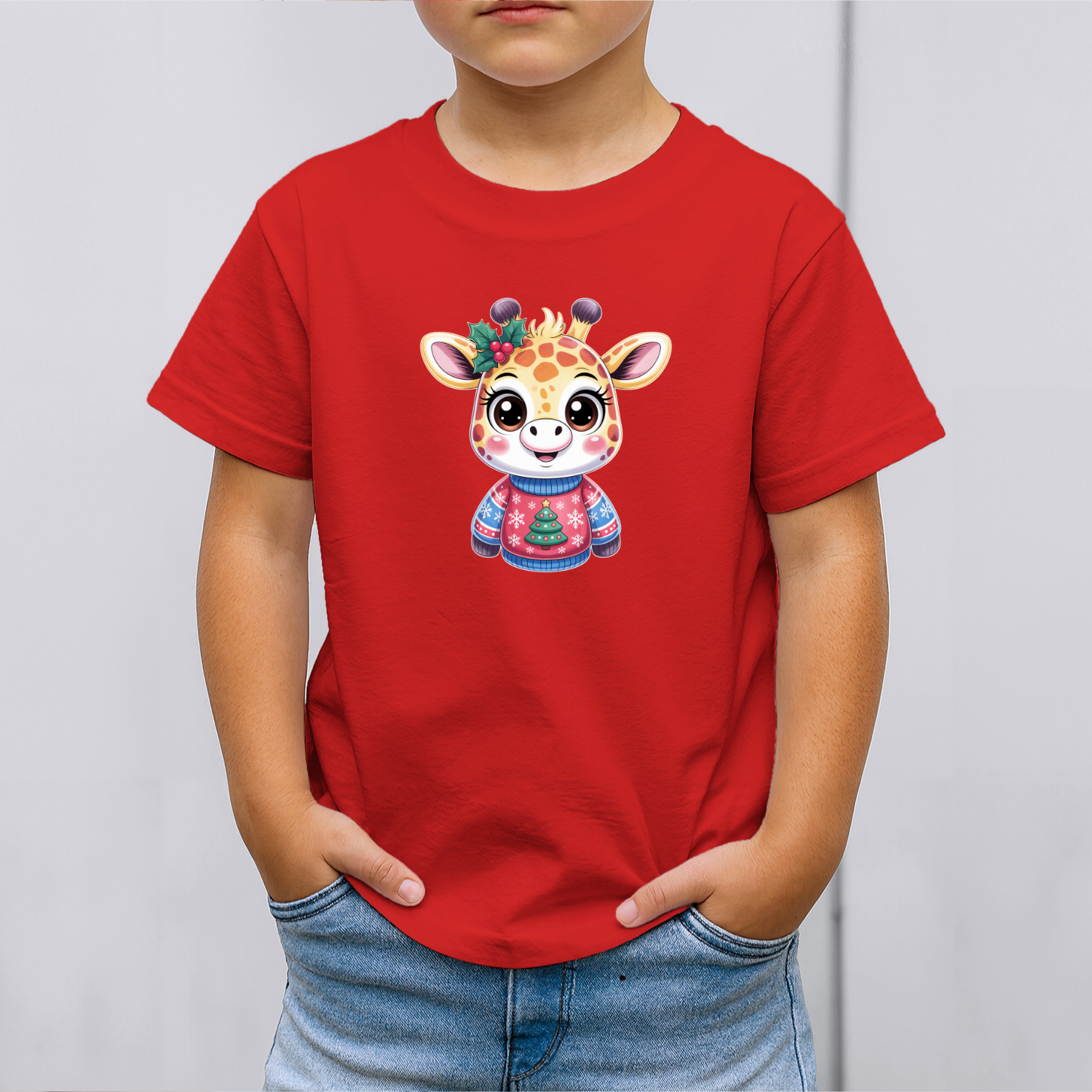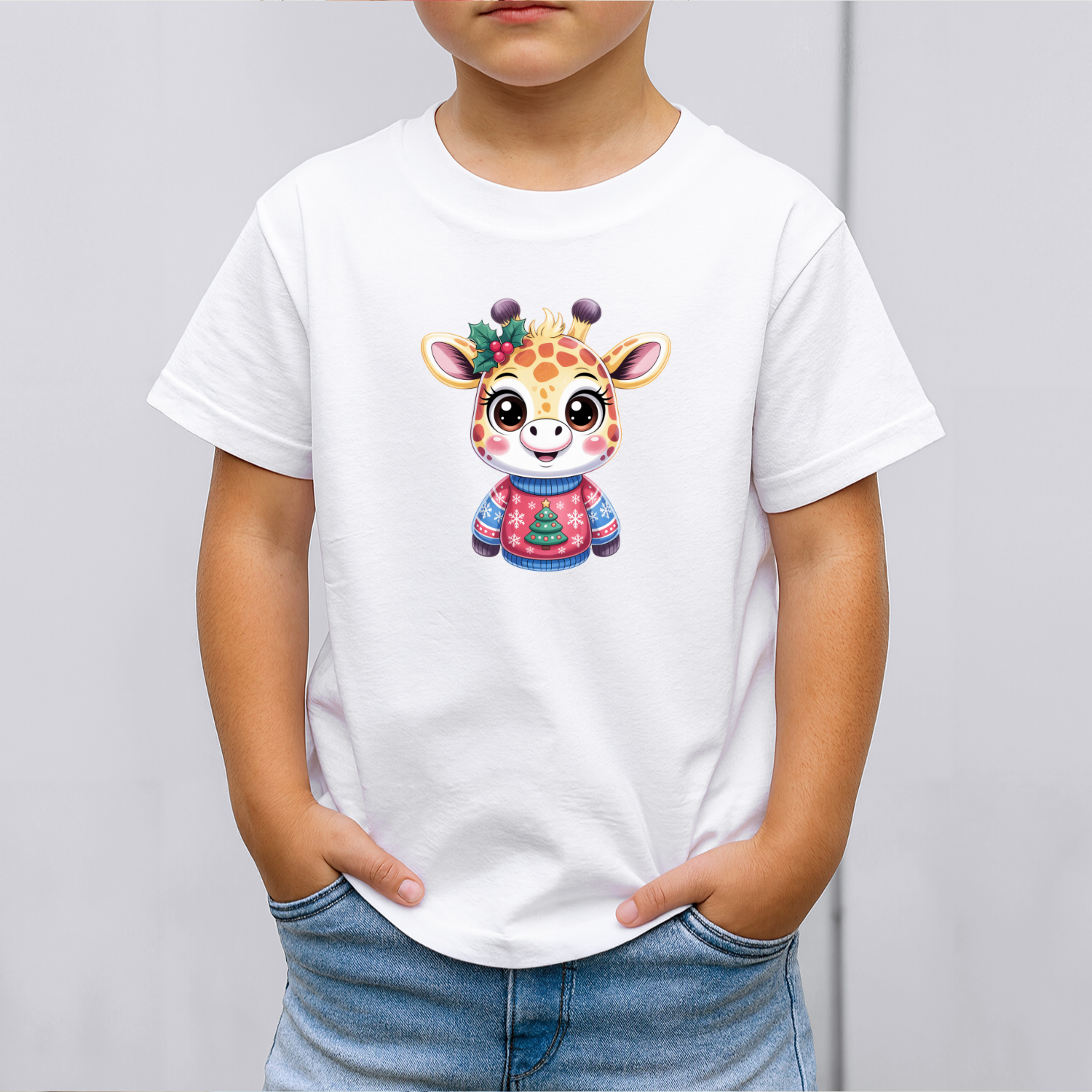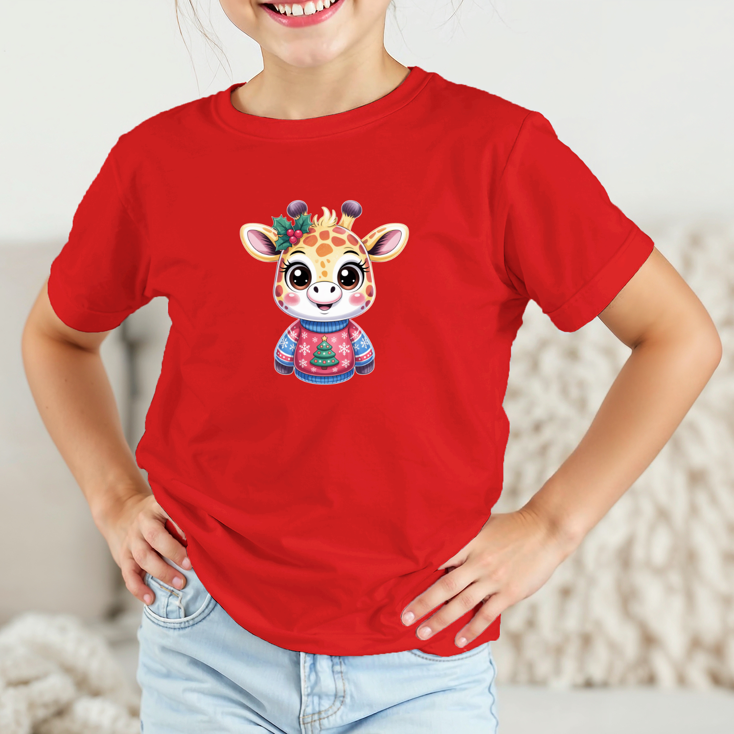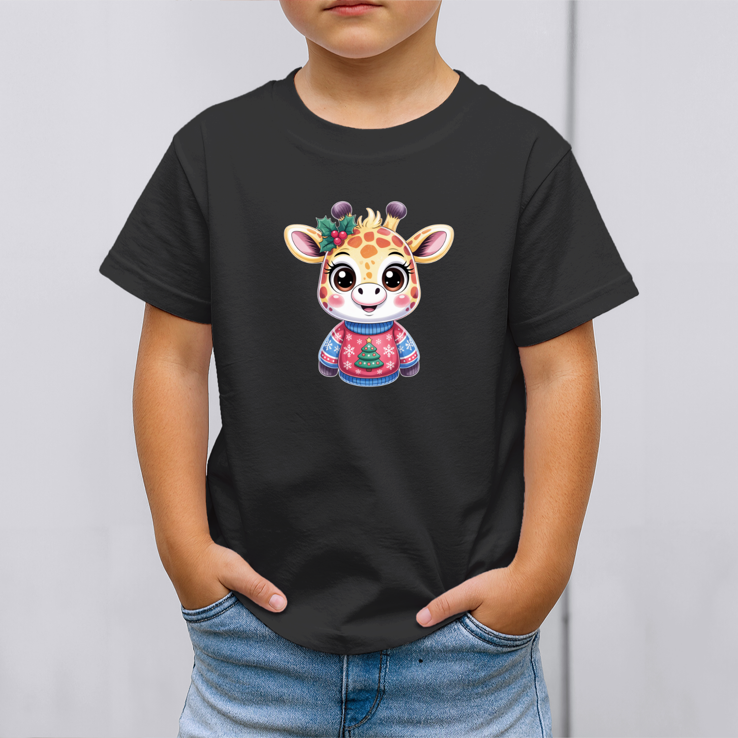 Būkite pirmas aprašęs “Vaikiški marškinėliai su spauda „Žirafa su kalėdiniu megztuku“”