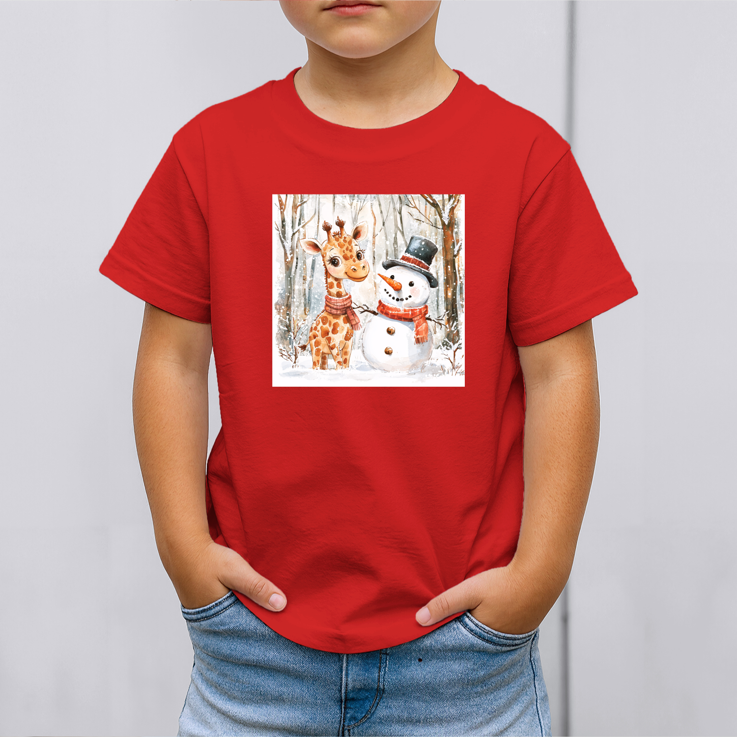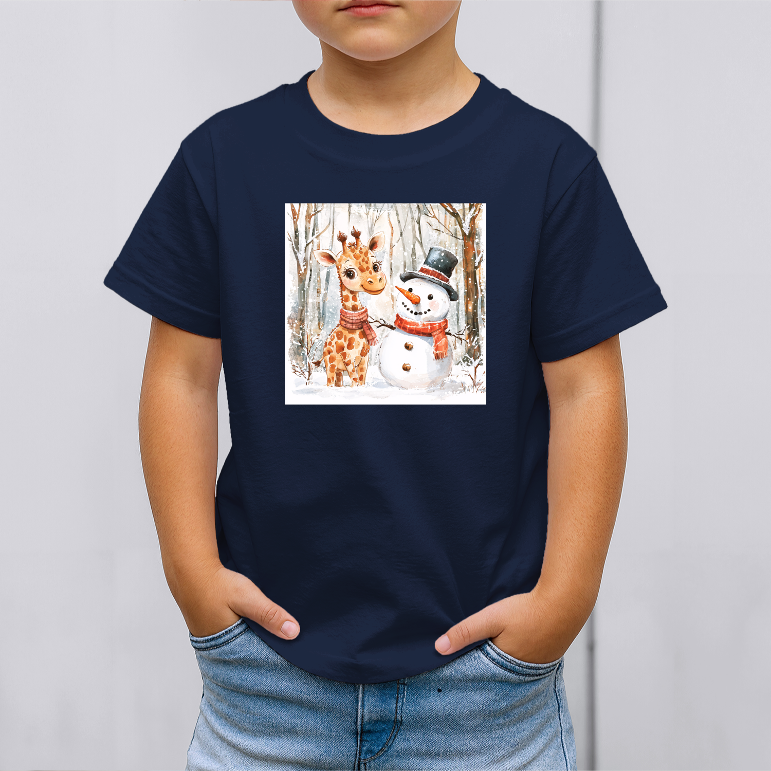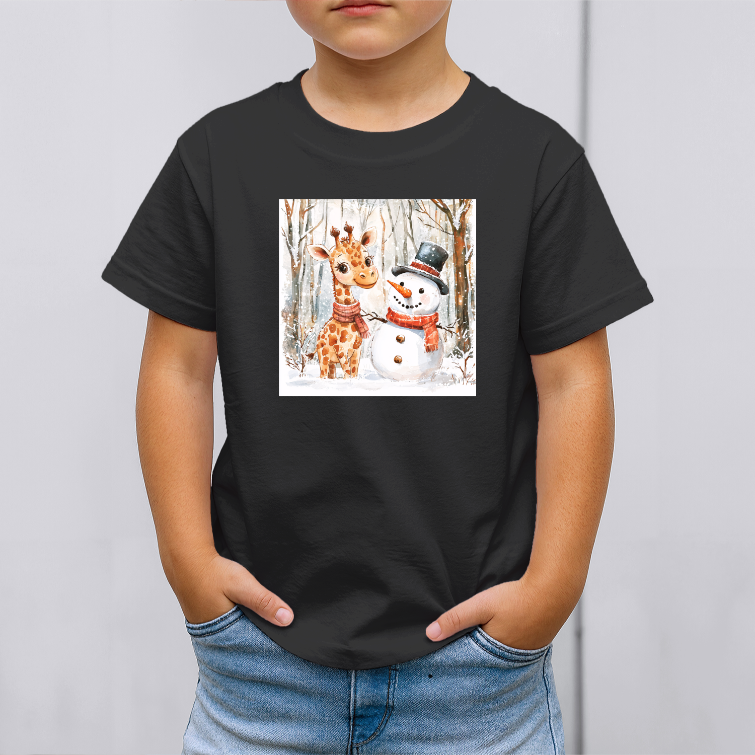 Vaikiški marškinėliai su spauda „Žirafos ir sniego senio draugystė“
